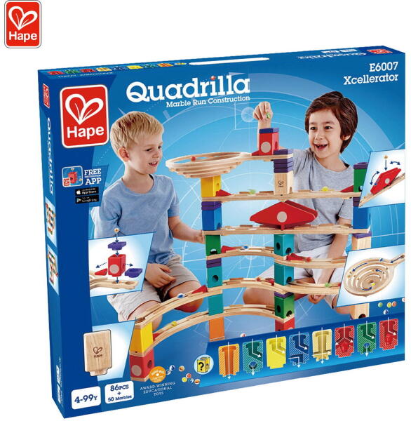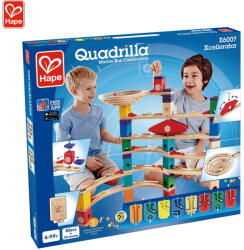 Hape Quadrilla Xcellerator: Fejleszd az építési készségeket ezzel a lenyűgöző golyópályával ? Az Xcellerator izgalmas módon ötvözi a sebességet és a pörgést! Egy spirális tölcsér, egyenes és ívelt sínek kombinációja, valamint 10 gyorsítóelem kihívást jelent a Quadrilla építőinek, hogy új irányokat és dimenziókat fedezzenek fel. Építs látványos pályákat, és kövesd a színes golyók mozgását. Miért válaszd a Hape Quadrilla Xcelleratort?Környezetbarát anyag: Kiváló minőségű fából készült, környezetbarát anyagok és nem mérgező festékek felhasználásával. Garantált biztonság: Megfelel a legmagasabb nemzetközi biztonsági szabványoknak (EN71, ISO9001, ASTM F963). Multiszenzoros fejlesztés: Serkenti a gyermekek érzékszervi, fizikai és érzelmi képességeit. Kreatív építés: Több mint 10 gyorsítóelem, valamint egyenes és ívelt sínek kombinációja teszi lehetővé a komplex és kreatív építményeket. Órákig tartó szórakozás: Egy játék, amely órákig tartó játékot és szórakozást kínál a gyermekek számára. Tartósság: Robusztus konstrukció a hosszú távú használat érdekében. Hape - Minőség és biztonság a gyermekekért!